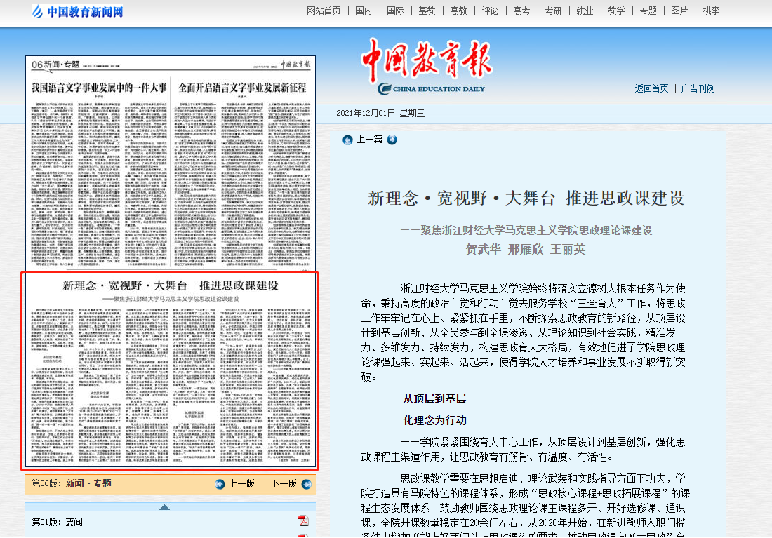 12月1日,《中国教育报》第六版以《新理念·宽视野·大舞台推进思政课建设为》为题,从理念引领、课程改革、教学育人、实践教学等四方面详细报道了公司思政课建设和教学改革的特色亮点。报道指出,海洋之神590线路检测中心在习近平总书记3·18重要讲话精神和“三全育人”的理念指引之下,不断探索思政教育新路径,...
