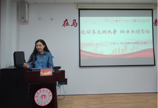 随后,浙江金融职业技术学院的朱佩伦老师用温柔而坚定的声音将一个个春天的故事向我们娓娓道来,生动体现了中国站起来、富起来、强起来的发展历程,致力于共同富裕的发展。最后,朱佩伦老师指出,春天的故事将继续,静待下个春天到来,下一个春天会叫伟大复兴。
